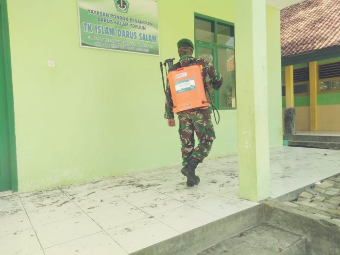 Kabartegas.net, Sampang- Anggota Koramil 0828/04 Bersama Anggota Polsek Torjun melakukan penyemprotan desinfektan di masjid darussalam tepatnya Di Desa torjun Kec. Torjun Kab. Sampang Jum,at pagi (17/04), Upaya yang dilakukan, Supaya masyarakat Nyaman saat melakukan sholat Jum’at, dan tidak panik, dengan memberikan edukasi bagaimana Menjaga lingkungan agar steril dari yang namanya covid- 19 Kepada masyarakat.