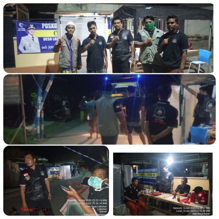 kabartegas.net, Sampang – Giat Sosial Kelompok Swadaya Masyarakat (KSM), Lembaga Swadaya Masyarakat Gerakan Masyarakat Bawah Indonesia (LSM GMBI), melakukan, Kerja Sama Dengan Pemerintah Desa Labuhan Kecamatan Sreseh Kabupaten Sampang, Menjadi Relawan dalam upaya pencegahan dan membasmi Covid-19 dengan Menjaga Portal yang Berada di ujung Barat Desa Labuhan tepatnya disusun Masaran, Kamis Malam(16/04), melakukan Penyemprotan di Setiap Kendaraan Yang Lewat dan Berasal dari luar daerah Khususnya Yang terpantau dari zona Merah.
