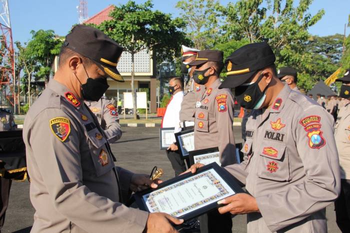 Sampang – Selasa (27/07/2021) Kapolres Sampang AKBP Abdul Hafidz S.IK, M.Si memberikan piagam penghargaan kepada 41 orang anggota Polres Sampang yang berprestasi dalam kerja khususnya dalam pengungkapan kasus pidana dan kegiatan-kegiatan menyukseskan program pemerintah dalam Pandemi Covid19.