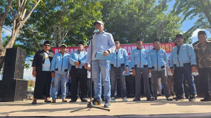 “ Kami para mantan kepada desa, melakukan deklarasi dukungan kepada paslon nomor Urut dua Prabowo Gibran menang satu putaran “ ucapnya diatas panggung, yang diikuti para mantan Kepala Desa dan Masyarakat yang hadir. Senin (05/01/2024).