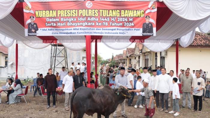 Lanjutnya, pada Hari Raya Idul Adha 1445 H/2024 M kali ini, Polres Tulang Bawang menyembelih 12 (dua belas) ekor hewan kurban yang terdiri dari 10 (sepuluh) ekor sapi, 1 (satu) ekor kerbau, dan 1 (satu) ekor kambing. Sebelum dilakukan penyembelihan terhadap hewan-hewan kurban tersebut, terlebih dahulu dilakukan penyerahan secara simbolis kepada pihak Panitia Kurban Presisi Polres Tulang Bawang.