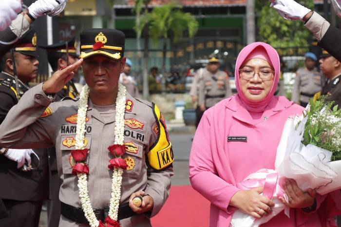 Saat akan memasuki Mapolres Sampang, Wakapolres Sampang Kompol Hosna Nurhidayah menyambut AKBP Hartono beserta istri di pintu masuk sisi utara untuk melaporkan situasi Kamtibmas wilayah hukum Polres Sampang dan Polsek jajarannya.