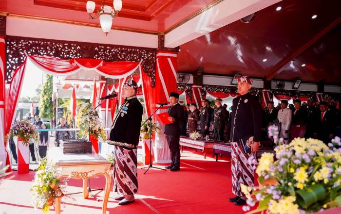 Upacara digelar di Pendopo Trunojoyo, Minggu (17/8/2025) dengan nuansa merah putih yang menghiasi tenda kehormatan.